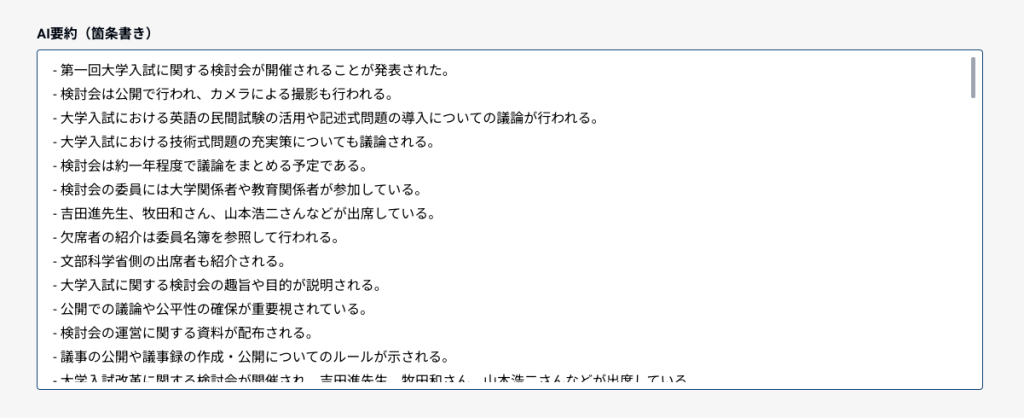 文字起こしデータの内容を簡潔に要点だけ知りたいという方向けにAI要約機能を提供しております。