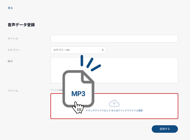 音声ファイルを自由にアップロード。選択した音声の文字起こし。