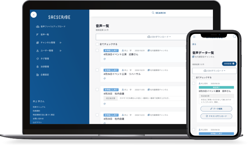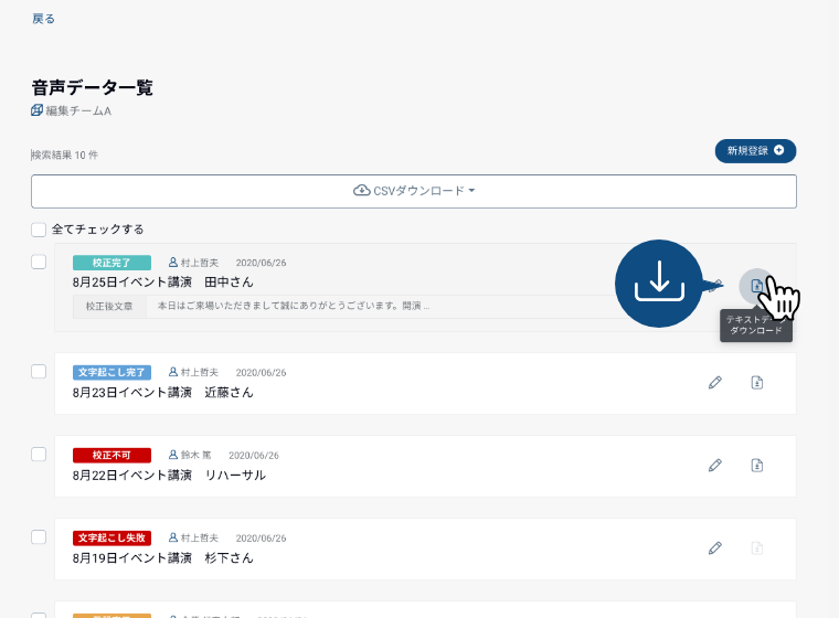 音声データを一覧形式で表示。文字起こしをしたもの・していないものもパッとひと目で分かる。CSVで一括データも出力可能。