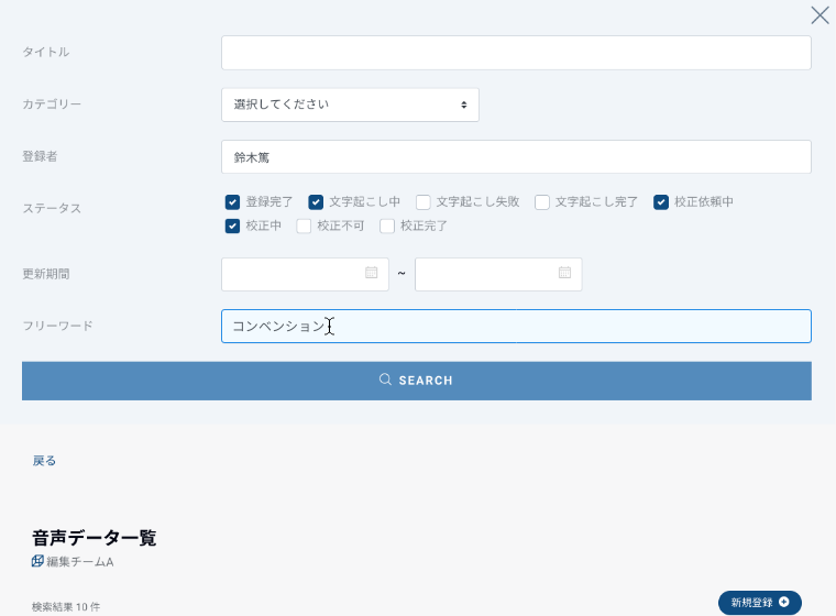 文字起こしデータは、多様な検索条件で抽出可能。キーワード単位でも検索できるので、ネガティブキーワードや重要キーワードが入っている文字起こしデータもすぐに発見。