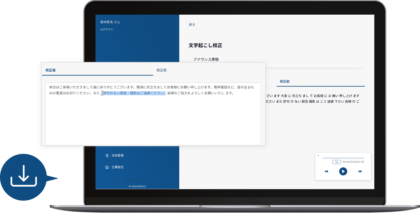 テキスト形式で出力。文字起こし後のデータも編集後のデータも自由にダウンロード可能。